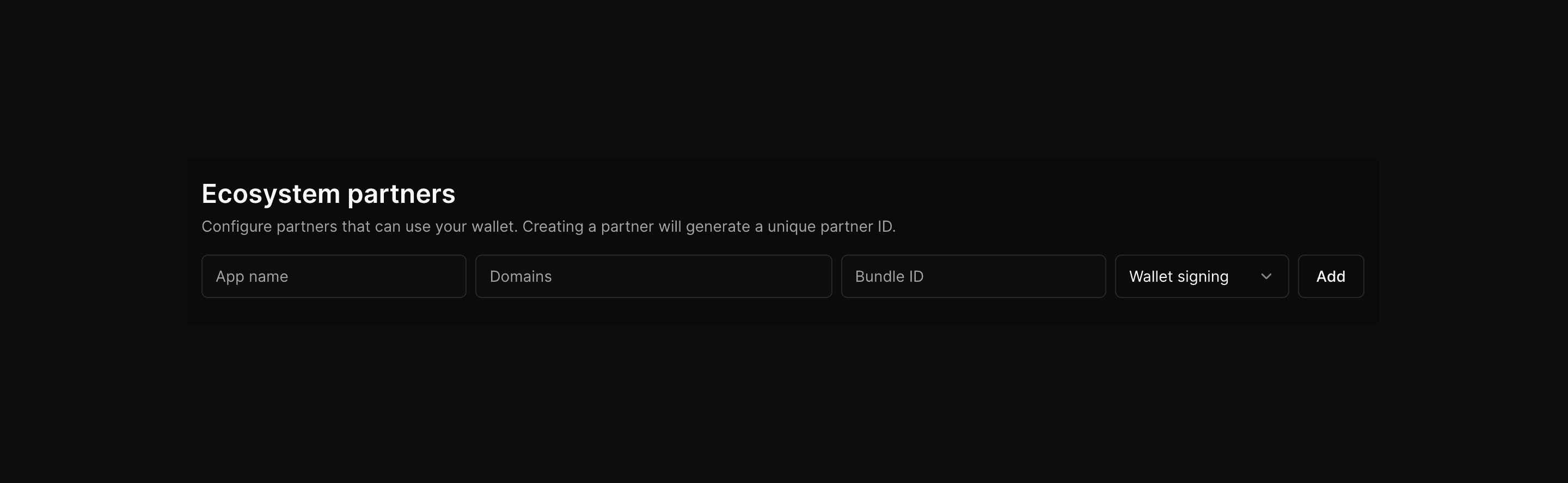 For each application on your allowlist, you'll need to specify a name, a list of allowed domains, wallet signing settings, and an optional bundle ID (for mobile applications). The list of domains will determine where a partner will be able to display your ecosystem as a login option. Once a partner is added, a Partner ID will be generated.